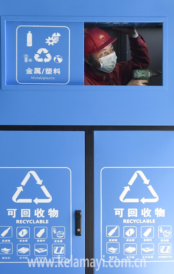 員工安裝分類垃圾箱門。