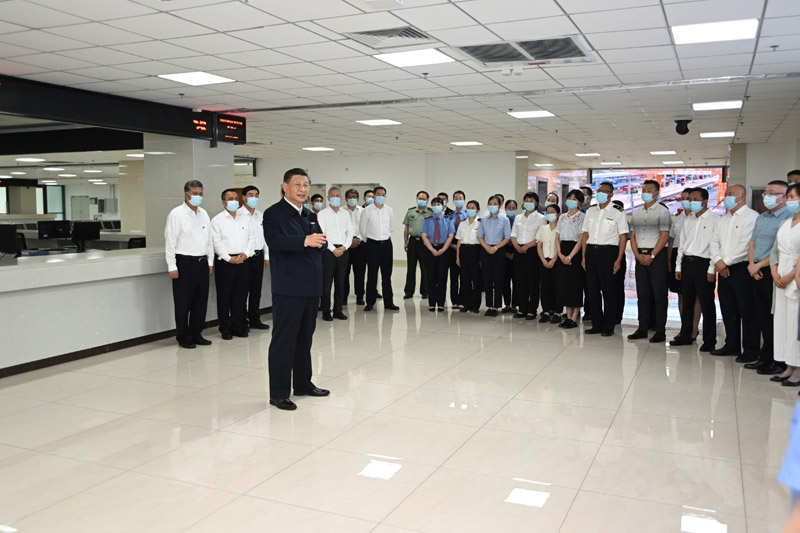 12日下午,習(xí)近平在烏魯木齊國際陸港區(qū),同工作人員及現(xiàn)場辦事人員親切交流。
