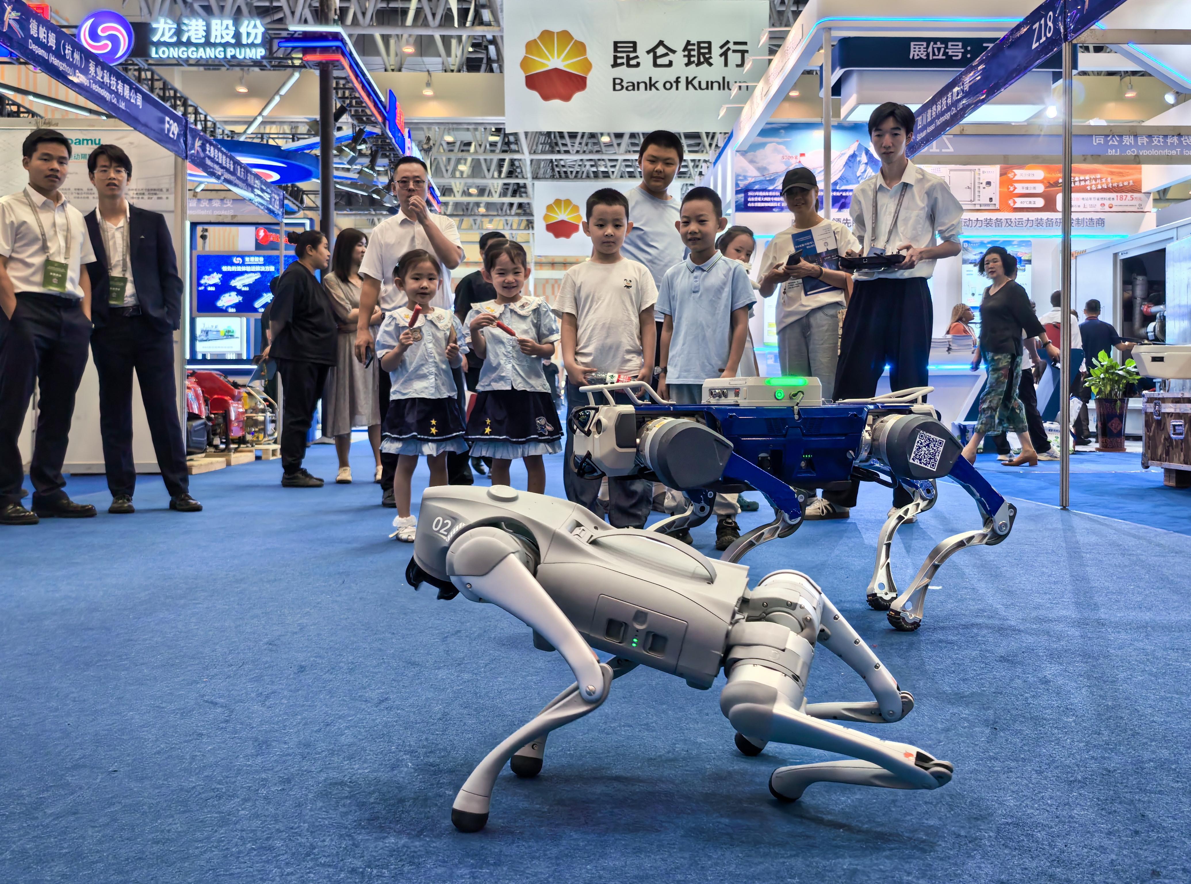 8月13日,第七屆中國(克拉瑪依)國際石油天然氣及石化技術(shù)裝備展覽會現(xiàn)場,市民帶著孩子近距離觀看參展商帶來的四足機(jī)人和機(jī)器狗。8月13日至15日,大會面向公眾免費(fèi)開放,公眾可攜帶身份證前往市會展中心參觀交流。