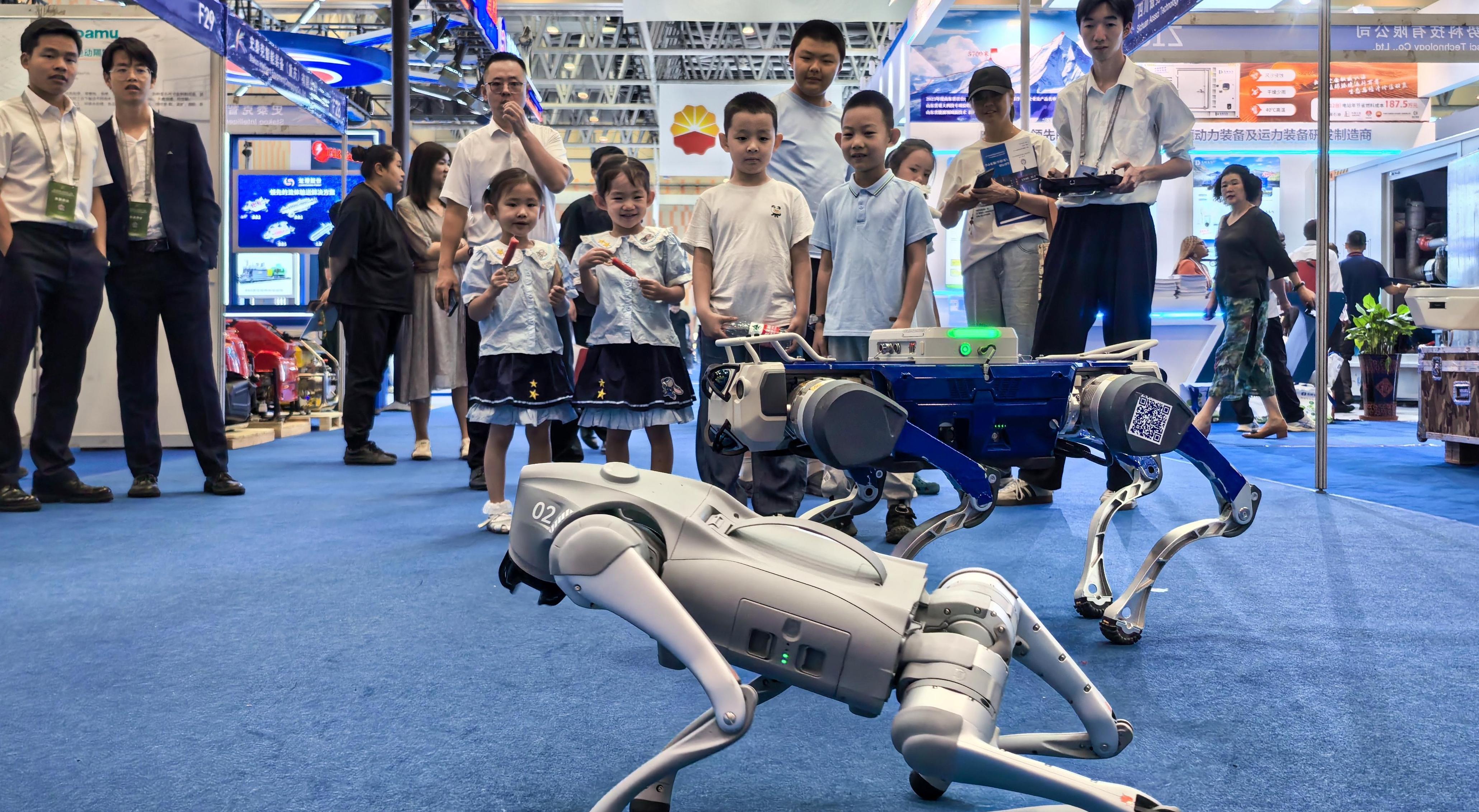 8月13日,第七屆中國(克拉瑪依)國際石油天然氣及石化技術(shù)裝備展覽會現(xiàn)場,市民帶著孩子近距離觀看參展商帶來的四足機人和機器狗。8月13日至15日,大會面向公眾免費開放,公眾可攜帶身份證前往市會展中心參觀交流。
