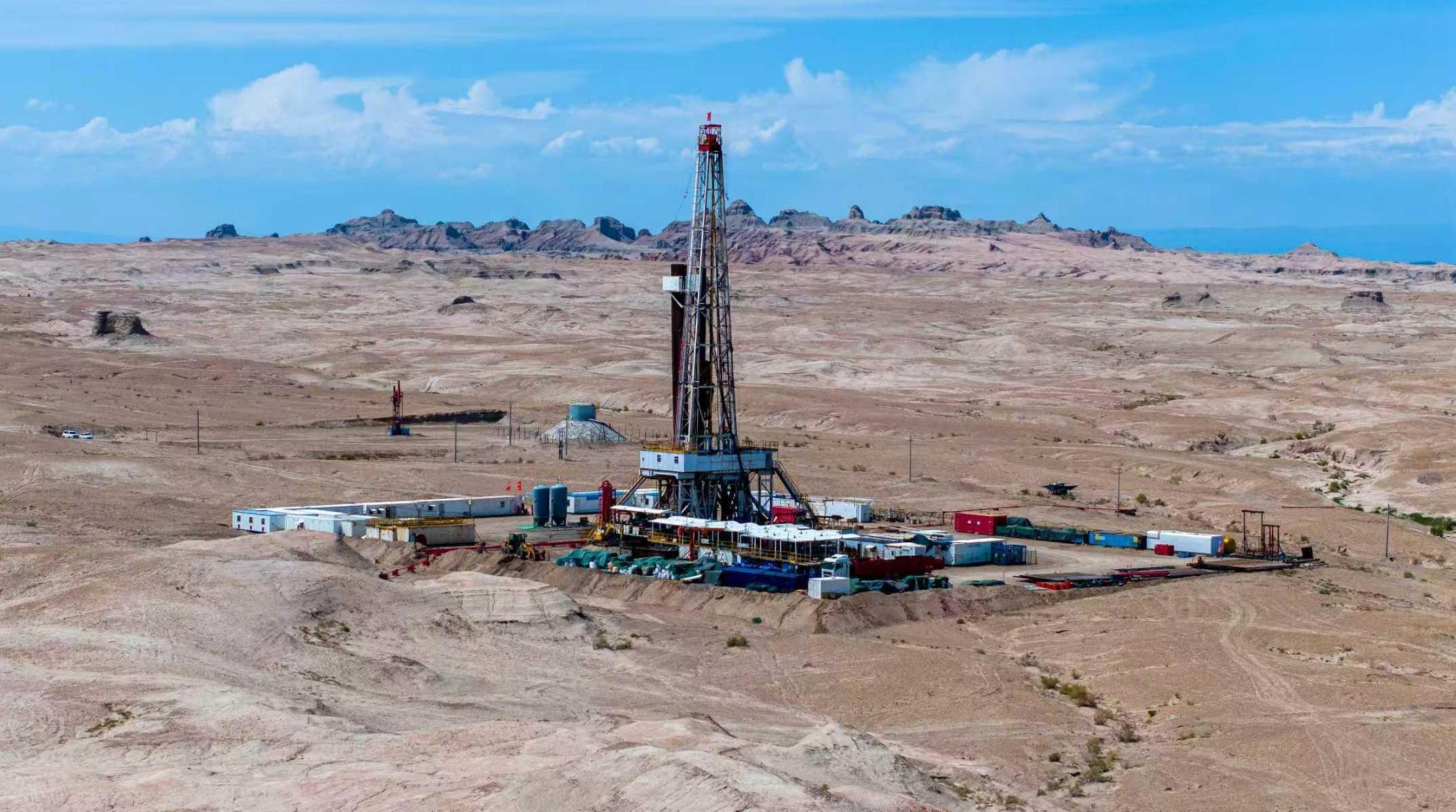 截至8月11日,新疆油田瑪北風城組瑪頁1先導(dǎo)試驗區(qū)首輪3口水平井順利完井,在鉆井提速、質(zhì)效提升等方面取得多項突破性成果,為瑪北頁巖油“54321”工程目標的實現(xiàn)奠定了堅實基礎(chǔ)。圖為7月30日,瑪湖油區(qū)瑪頁1井區(qū)高聳的鉆塔。