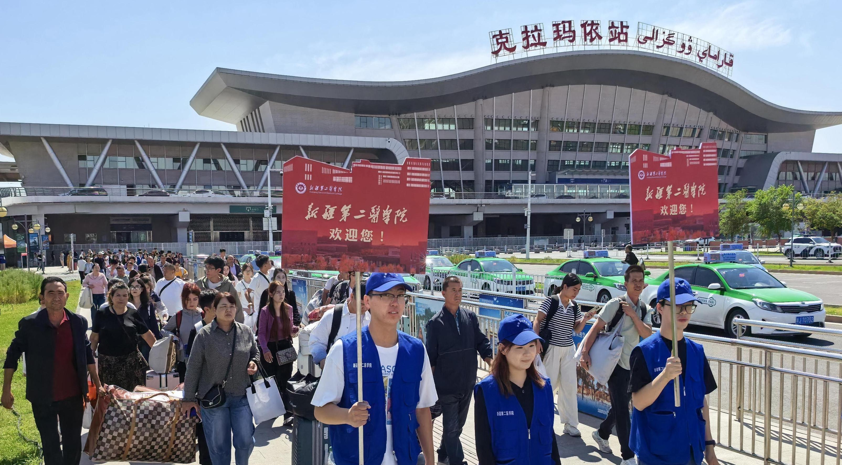 8月23日,新疆第二醫(yī)學院志愿者在克拉瑪依火車站迎接新生和學生家長。8月23日至24日,來自全國25個省區(qū)市的1991名本科新生到新疆第二醫(yī)學院報到入學。150名志愿者奔波于克拉瑪依機場、火車站和學校,為新生和家長們提供全天候的引導(dǎo)、咨詢和行李運送服務(wù)。