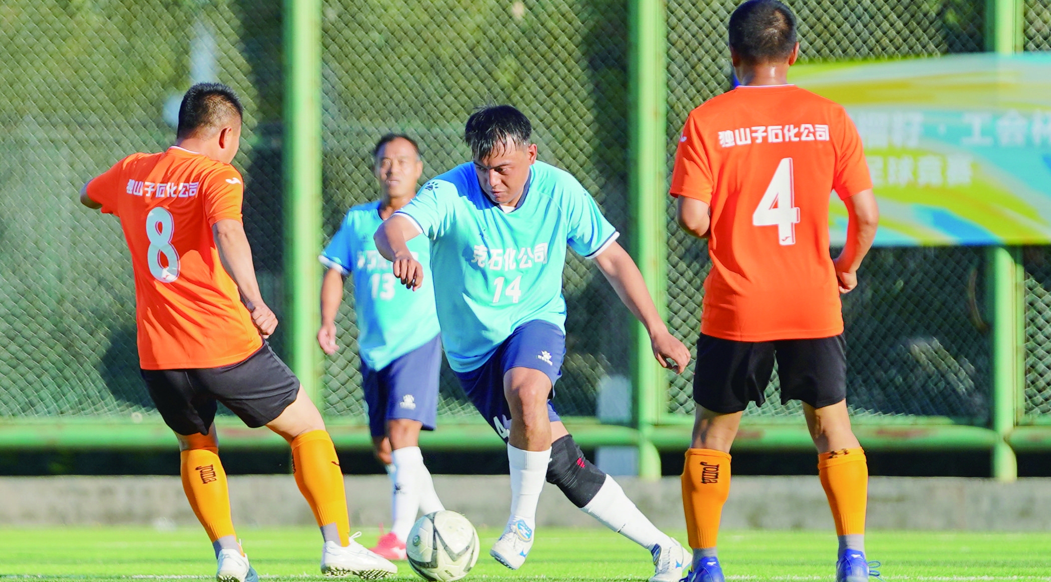 9月5日,市區(qū)生態(tài)休閑健身公園8人制足球場,獨山子石化公司隊(橘衣)與克拉瑪依石化公司隊(藍衣)正在激烈比拼。當天,由市總工會主辦的“石榴籽·工會杯”2025年職工足球比賽激情開賽。
