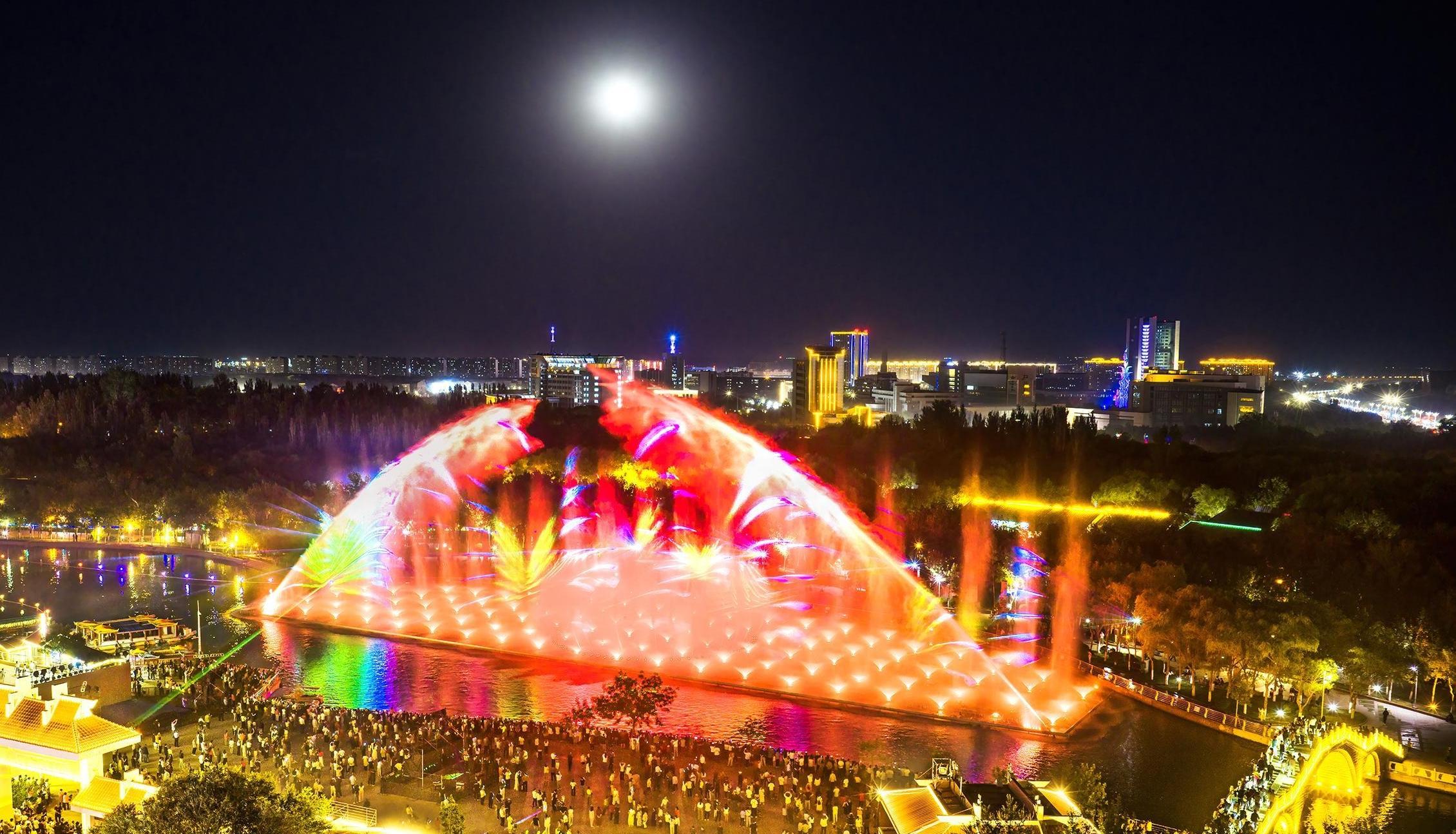 9月7日夜,一輪圓月從地平線緩緩升起,皎潔的月光照耀油城,與克拉瑪依河及河上景觀橋梁、中心景區(qū)噴泉以及世紀公園、城南商務(wù)區(qū)的燈火交相輝映、美不勝收。