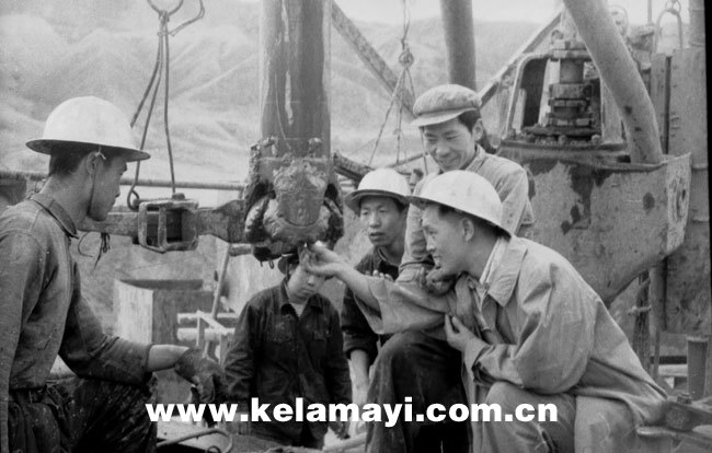 1958年6月,鉆井技術(shù)人員正在根據(jù)鉆頭工況判斷地層情況。本報(bào)通訊員 丁渡舟 攝