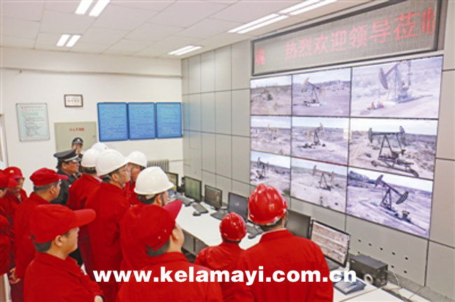2015年,采油一廠車排子作業(yè)區(qū)車2中心站中控室大屏幕前,參觀人員可以直接觀看到油井生產(chǎn)實(shí)況。本報(bào)通訊員 白洋 攝