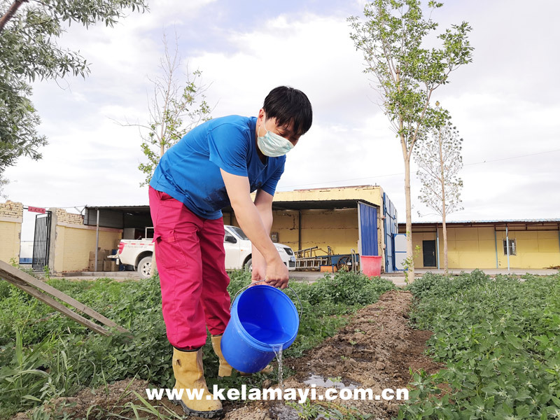 晚飯后,調度員楊磊利用閑暇時間澆灌瓜苗。本報實習記者 沈奧清 攝