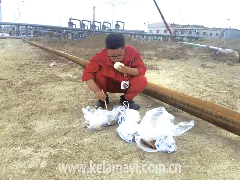宋晶晶因為流化床點爐工作錯過午飯時間,在班組打包了簡單的飯菜和饅頭便在井場簡單吃了幾口。