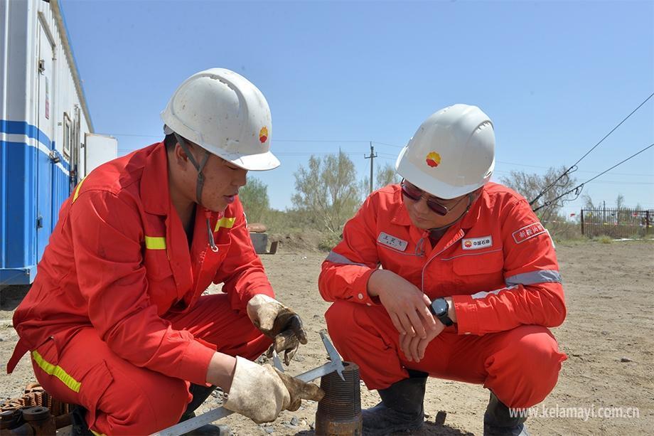 采油一廠工藝所工作人員與承包商負(fù)責(zé)人討論器具尺寸。新疆石油報(bào)通訊員 趙宏廈 攝