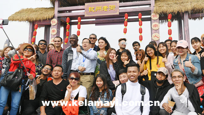 11月2日上午,“欽州老街”門頭前,中外游客與老街一起合影。當(dāng)天,“蠔鄉(xiāng)蠔情,歡樂欽州”2019年欽州蠔情節(jié)開幕,蠔情節(jié)的系列活動將持續(xù)一個月。