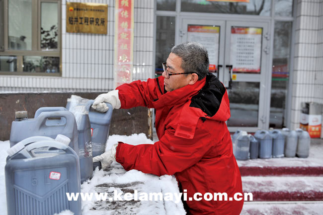 鉆井工程研究所的工作人員正把井上的泥漿樣品裝車送檢。