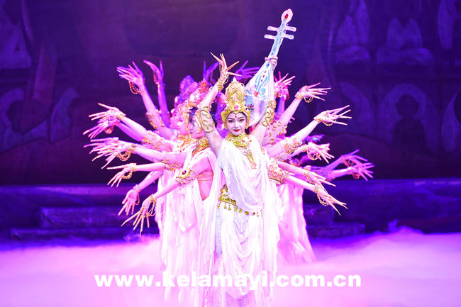 舞劇《絲路花雨》中,《千手觀音》等經(jīng)典舞段輪番上演。 本報記者 張玨 攝
