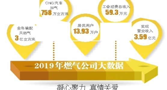 ????2019年,燃?xì)夤救贻斉涮烊粴?億立方米,CNG汽車加氣758萬(wàn)立方米,居民用戶13.93萬(wàn)戶,商業(yè)用戶1706戶,實(shí)現(xiàn)營(yíng)業(yè)收入3.59億元,成本支出4.28億元。
