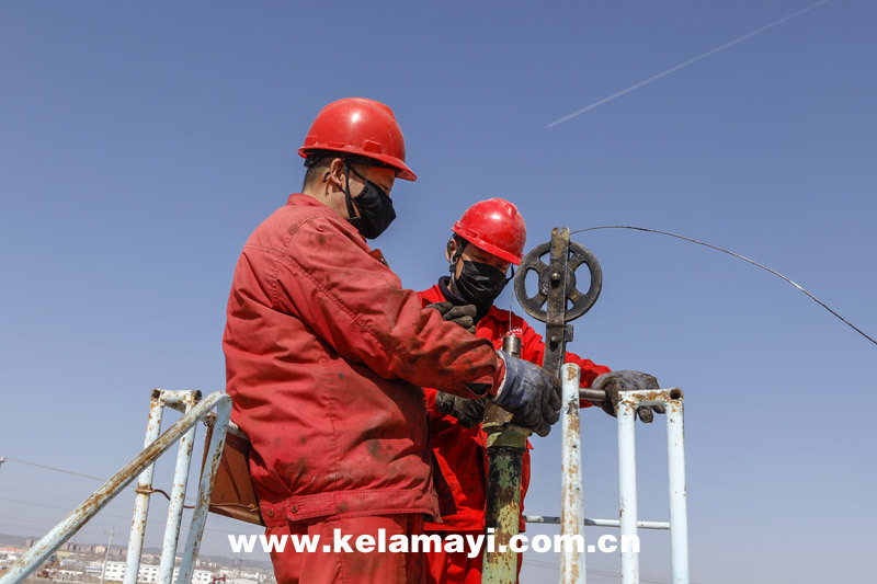 員工正在采油二廠第三作業(yè)區(qū)進(jìn)行產(chǎn)液剖面測(cè)井施工。