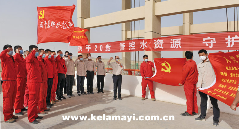 ????克拉瑪依市水務(wù)公司各級(jí)黨員干部和上游建管單位的黨支部全體黨員20余人,在分水閘處共同開(kāi)展了主題黨日活動(dòng),全體黨員重溫了入黨誓詞。