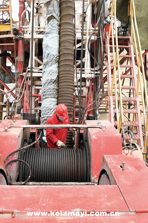4月16日,地質(zhì)工程公司鉆井隊隊員在施工作業(yè)的鉆臺下檢查設(shè)備安全運行情況。
