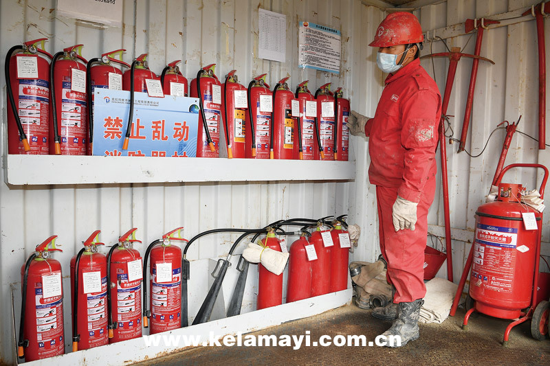4月16日下午,地質(zhì)工程公司鉆井8隊隊員正在作業(yè)現(xiàn)場檢查消滅火器、消防錘等消防安全器材的完好情況。