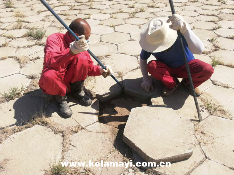 白堿灘管理站員工對六角塊進行勾縫處理。
