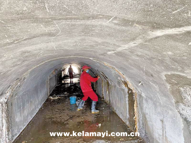 白堿灘管理站員工對涵洞結構縫滲水進行處理。