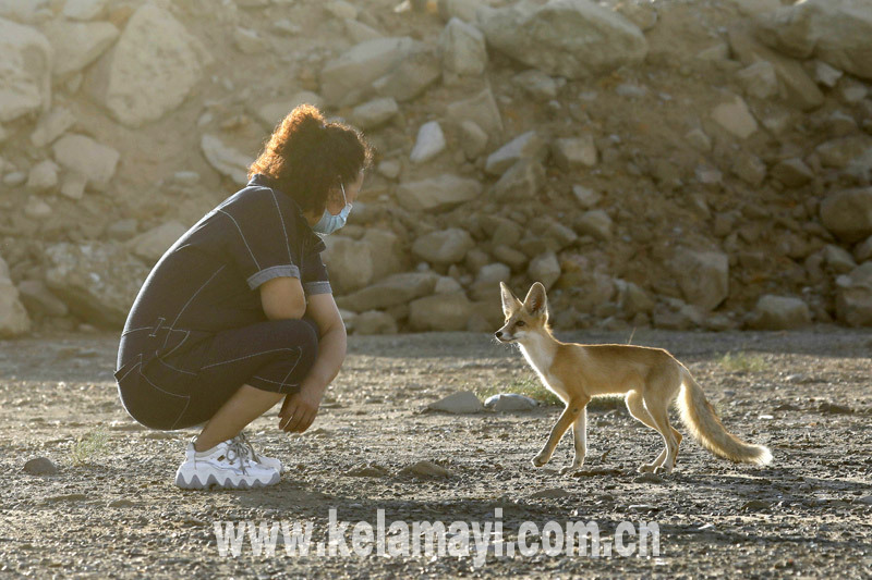 7月23日,在克拉瑪依市區(qū)西郊的一處山坡下,小狐貍緩緩走向趙玉琴,近距離凝視給自己送了一個(gè)多月食物的恩人。