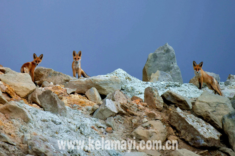 7月6日,三只小狐貍吃飽喝足后在山頂上眺望。
