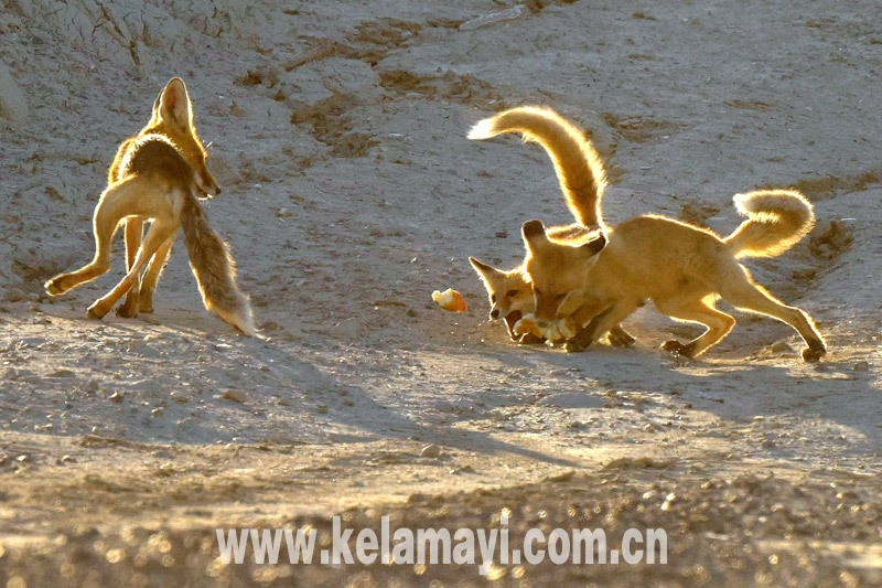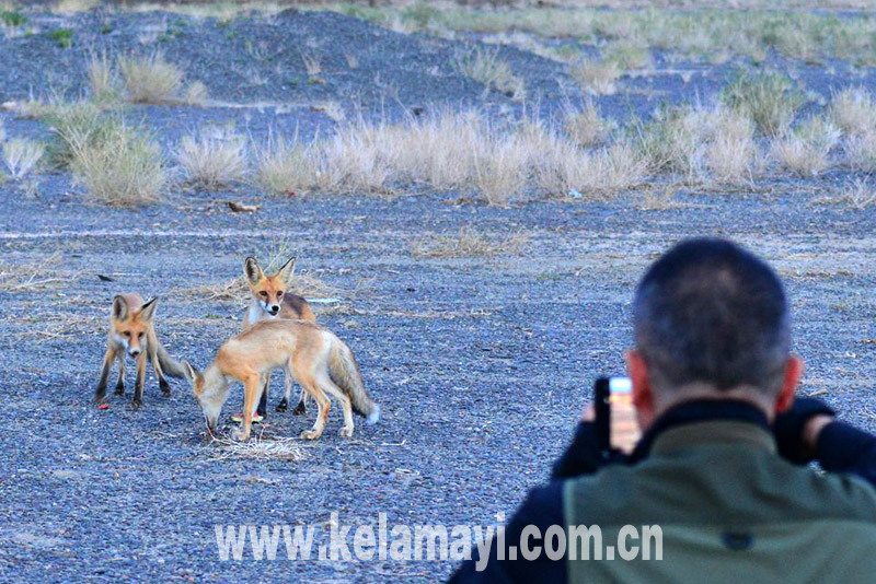 ????后來有一天,兄妹倆躲在車內(nèi)用長(zhǎng)鏡頭相機(jī)觀察3只小狐貍時(shí),大狐貍已悄悄來到車后,突然叼起一個(gè)大馕餅,迅速跑開了。