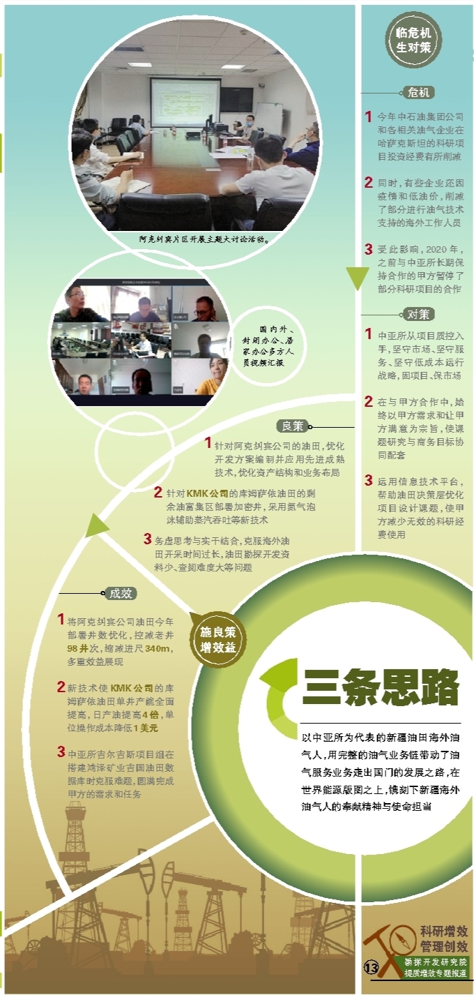 ????而高質(zhì)量、高品質(zhì)的油氣優(yōu)化開發(fā)方案,取決于高水平的科研人員。為此,在海外科研項(xiàng)目因疫情低油價(jià)影響而大幅下滑的情況下,中亞所將打造提升團(tuán)隊(duì)科研能力和協(xié)同工作能力作為應(yīng)對(duì)疫情和低油價(jià)危機(jī)的出口,變“熬冬”為“冬訓(xùn)”,從工作思維到工作流程再到工作措施方法等方面,全方位疏通流程環(huán)節(jié),提升團(tuán)隊(duì)科研能力和協(xié)同工作能力。