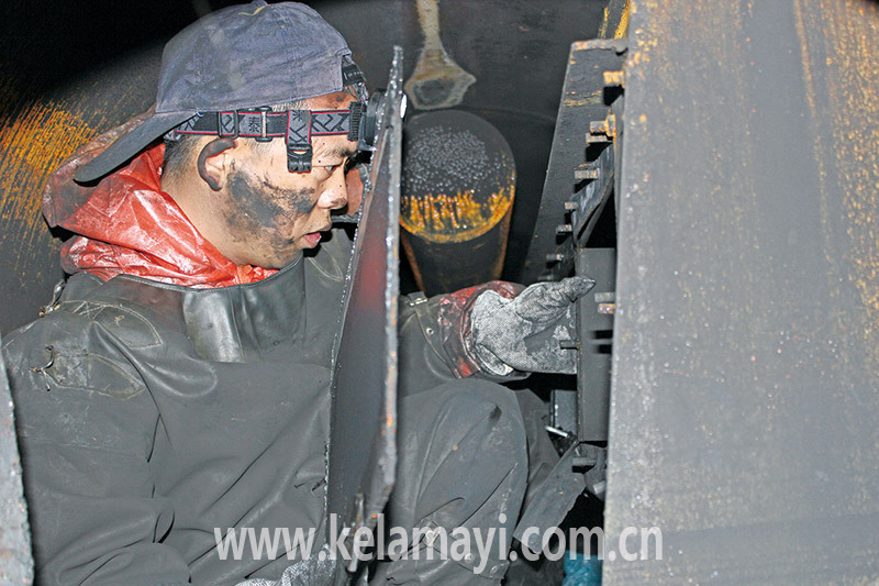 采暖期一結(jié)束,員工們就投入到忙碌的檢修工作中,一名工人正在鍋爐內(nèi)檢修作業(yè)。(圖片攝于疫情前)