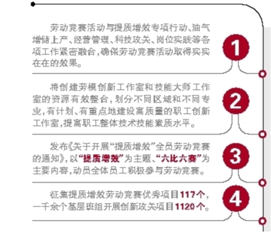????為了將勞動競賽與崗位實踐緊密融合,油田公司發(fā)布了《關(guān)于開展“提質(zhì)增效”全員勞動競賽的通知》,以“提質(zhì)增效”為主題、“六比六賽”為主要內(nèi)容,動員全體員工積極參與勞動競賽。依托職工創(chuàng)新工作室等平臺,開展“五新五小”、合理化建議征集等群眾性挖潛活動,激發(fā)全員創(chuàng)新智慧和創(chuàng)效活力。截至目前,共征集提質(zhì)增效勞動競賽優(yōu)秀項目117個,一千余個基層班組開展創(chuàng)新攻關(guān)項目1120個。
