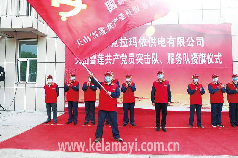 天山雪蓮共產(chǎn)黨員服務(wù)隊(duì)(突擊隊(duì))授旗儀式。 本版圖片由國網(wǎng)克拉瑪依供電有限公司提供