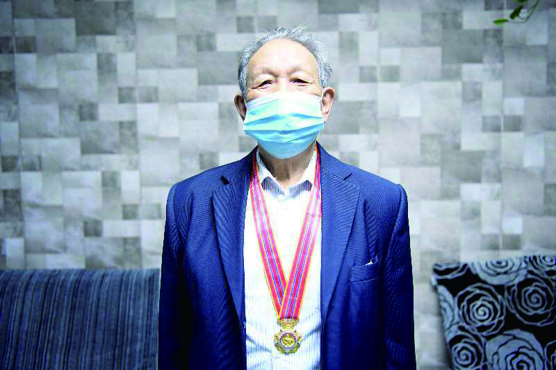 戴上紀(jì)念章后,85歲的古大明站得筆直。 本版圖片由本報(bào)通訊員 周建玲 攝