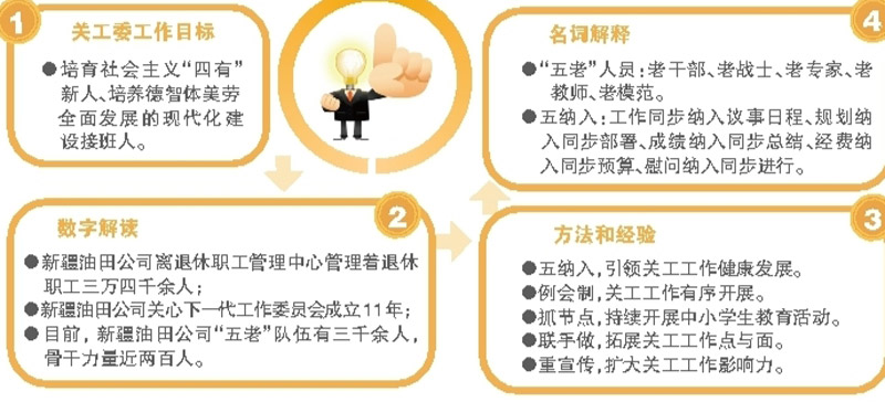 ????聯(lián)手做,拓展關(guān)工工作點(diǎn)與面。關(guān)工委堅(jiān)持企地?cái)y手、資源共享、齊心聚力的工作方式。各級(jí)關(guān)工組織主動(dòng)與街道、社區(qū)、學(xué)校和企業(yè)各方加強(qiáng)溝通、相互配合、攜手并進(jìn),創(chuàng)造出街道、社區(qū)、學(xué)校和企業(yè)“四位一體”關(guān)工工作格局。特別是與企業(yè)共同探討青年員工的傳承教育,“五老”講師團(tuán)講師堅(jiān)持深入生產(chǎn)一線為青年員工講授克拉瑪依發(fā)展創(chuàng)業(yè)史等活動(dòng)的開(kāi)展,更是助力了關(guān)工工作的落實(shí)落地。