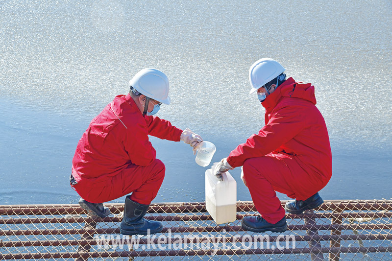 科研人員進行油田采出水現(xiàn)場取樣工作。