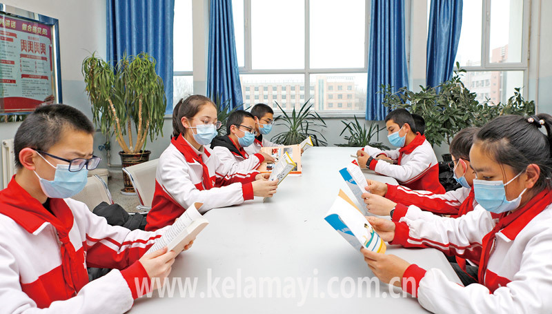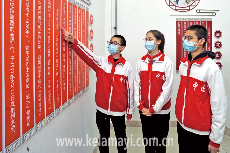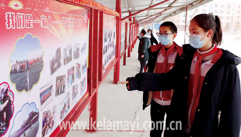 ????在校園中,有這么一處深深吸引古麗柯孜·阿迪力和同學(xué)們的地方——民族團(tuán)結(jié)文化長廊。長廊長約百米,位置靠近學(xué)校大門口,平時學(xué)生往來頻繁。它內(nèi)容豐富、色彩鮮艷,通過圖片、文字直觀形象地展示了一個個發(fā)生在校園里的民族團(tuán)結(jié)故事、一幕幕各族師生交流交往的動人畫面。來得次數(shù)多了,古麗柯孜·阿迪力對展板的內(nèi)容如數(shù)家珍,她最熟悉的是民族團(tuán)結(jié)標(biāo)志“和和”“美美”,寓意著第五中學(xué)師生、師師、生生、班班像兩顆鮮紅的石榴緊緊地依偎在一起。