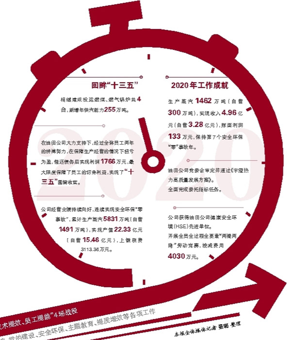 ????剛剛過(guò)去的2020年,是宇澄熱力公司生產(chǎn)經(jīng)營(yíng)形勢(shì)異常嚴(yán)峻的一年。面對(duì)新冠肺炎疫情蔓延、國(guó)際油價(jià)斷崖式下跌、供汽整合業(yè)務(wù)歸核化帶來(lái)的嚴(yán)重沖擊,公司認(rèn)真貫徹落實(shí)市委、市政府和油田公司黨委各項(xiàng)工作安排,緊緊圍繞年度業(yè)績(jī)目標(biāo)任務(wù),全力打好“黨建提質(zhì)、管理提速、技術(shù)提效、員工提能”四場(chǎng)戰(zhàn)役,在疫情防控、黨的建設(shè)、維護(hù)穩(wěn)定、安全環(huán)保、主題教育、提質(zhì)增效“兩提兩降”等方面均取得明顯成效,在全體員工的共同努力下,全面完成油田公司各項(xiàng)業(yè)績(jī)考核指標(biāo),全年工作順利收官。