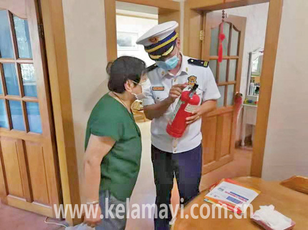 2020年7月30日,時任克拉瑪依區(qū)消防救援大隊大隊長宋學銳給居民贈送消防安全“大禮包”。