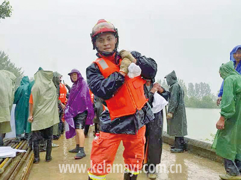 克拉瑪依區(qū)消防救援大隊銀河路消防救援站站長助理鄭偉正在安徽參加抗洪搶險工作。(拍攝于疫情前)