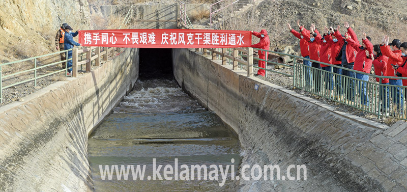 水流涌入風(fēng)克干渠,朝著克拉瑪依九龍?zhí)度Α氨寂堋薄?/p>