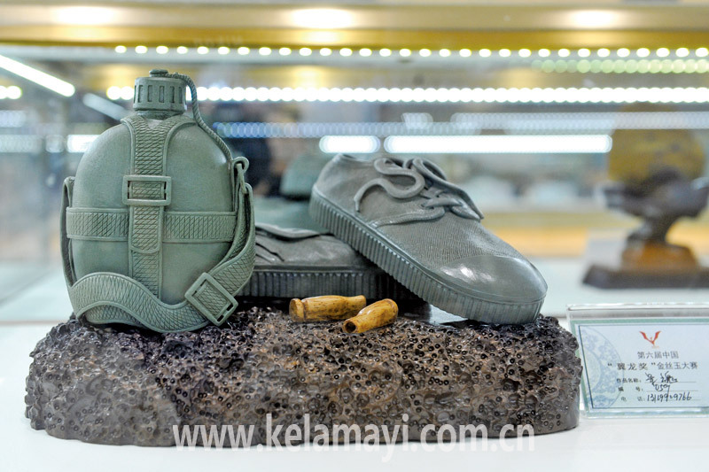 ????五光十色的金絲玉被能工巧匠雕琢成千姿百態(tài):軍綠色的天然原石被雕刻成一把水壺、一雙球鞋,取名“軍魂”;一塊灰色黃色相間的彩石上用浮雕手法雕成的山水圖景,取名“盛世輝煌”;由彩色小塊石料鑲嵌成的手鏈,取名“五彩繽紛”。