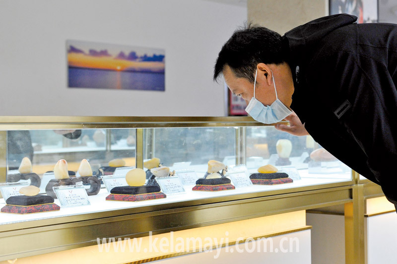 ????“你們來看看,鴨子下的蛋也沒有咱這石頭圓吧!”家住烏爾禾的玉石收藏者李小珍帶著家中寶貝來參展。她把一個橢圓形的白色石頭舉向燈光,驕傲地對圍觀游客兜售。