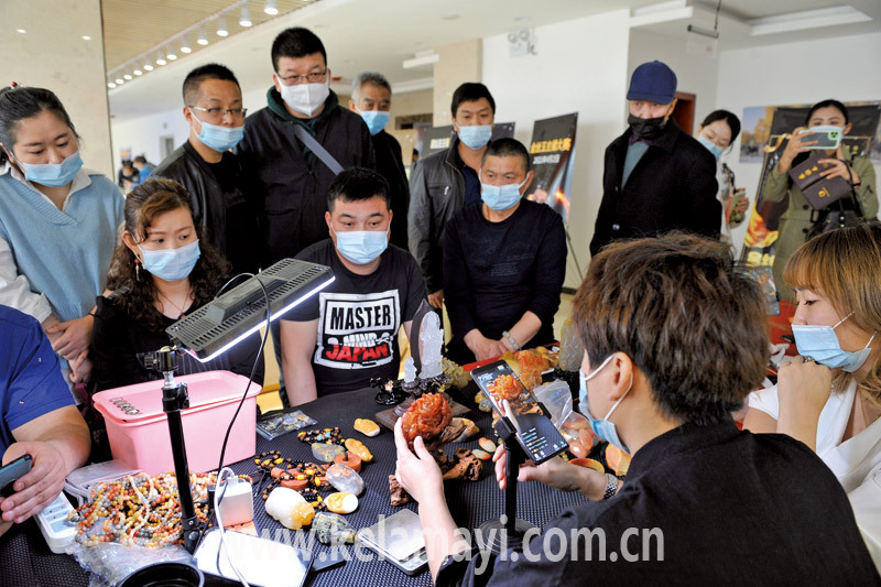 ????小瑞手捧一件色彩鮮艷、光澤油潤、雕工精美的金絲玉擺件。她首先介紹了擺件的形狀、成色及獲獎情況,吸引觀眾的關注。直播平臺當時有近一萬五千名觀眾在線觀看和參與購買。現(xiàn)場圍觀的人也十分熱情,大家都想一睹主播現(xiàn)場帶貨的風采。