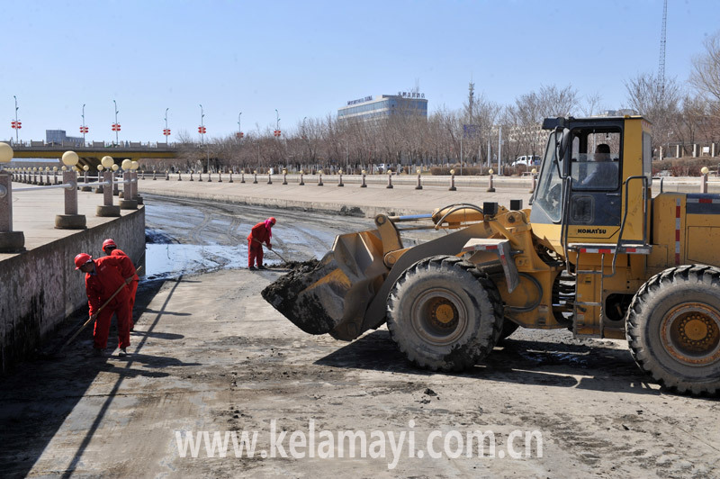 克拉瑪依河通水前,市水務(wù)公司安排施工人員進(jìn)行最后一次清淤工作,確保河道清潔、暢通。全媒體記者 蔣劍 攝