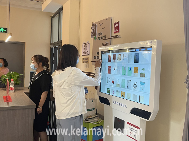 在克拉瑪依區(qū)城南職工書屋,參觀人員體驗數(shù)字借閱機。