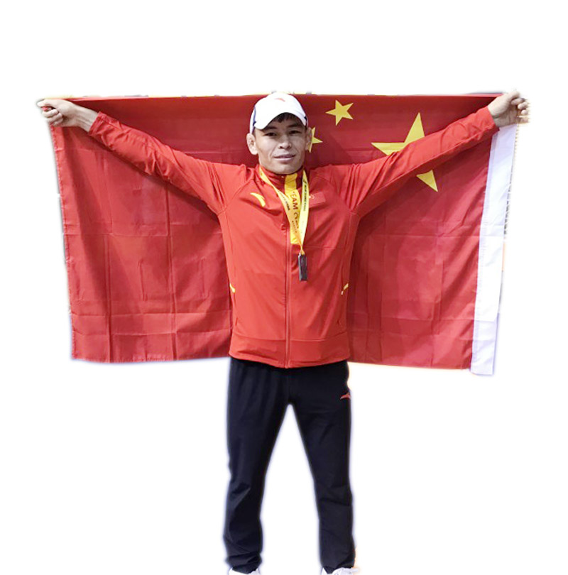 在2018年世錦賽獲得銅牌后,瓦里汗·賽里克與國旗合影。 (圖片由自治區(qū)體育局提供)