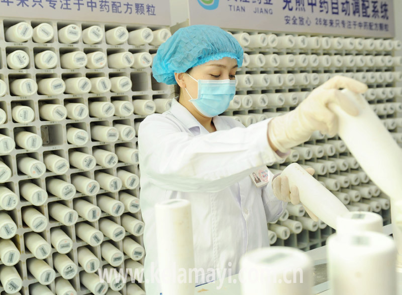藥劑科 醫(yī)生使用中藥免煎顆粒系統(tǒng)為患者制劑。