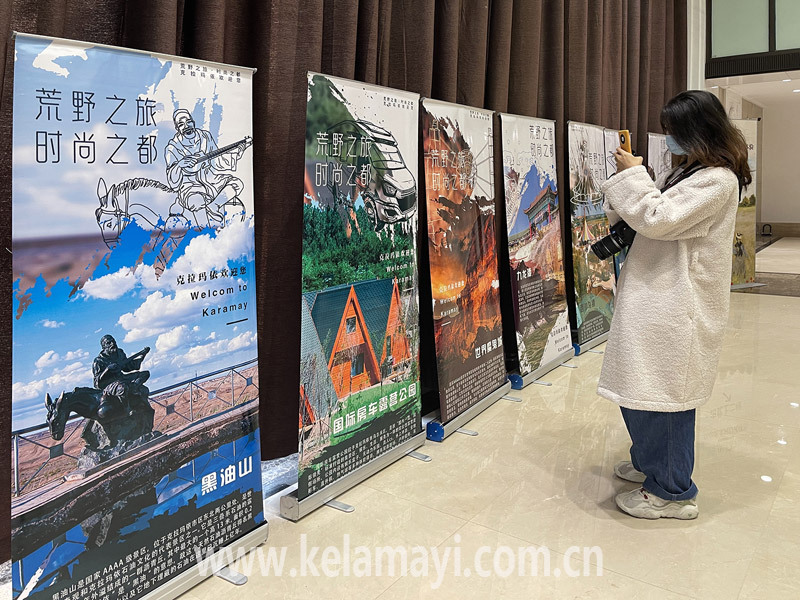 展廳門前布滿展示克拉瑪依的宣傳畫。