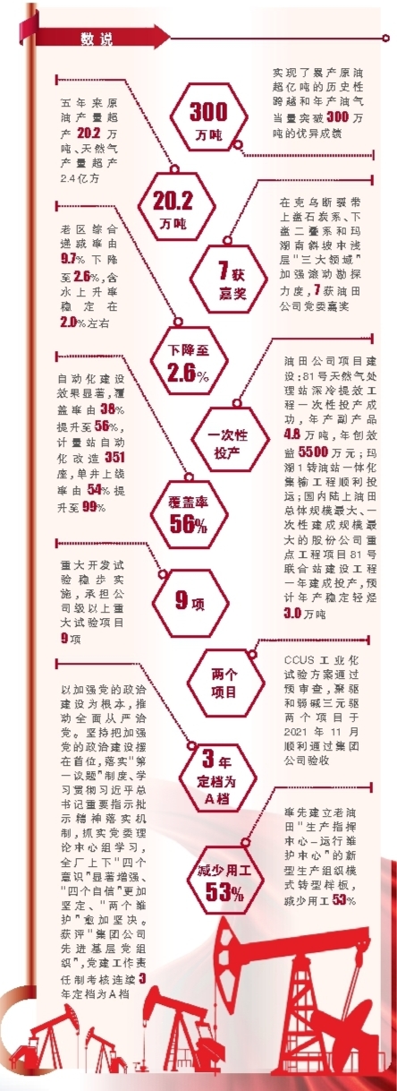 ????五年來,采油二廠在全體員工拼搏努力下,年產(chǎn)油氣當(dāng)量突破300萬噸,實現(xiàn)跨越式增長,牢牢占據(jù)油田公司增儲上產(chǎn)排頭兵地位。