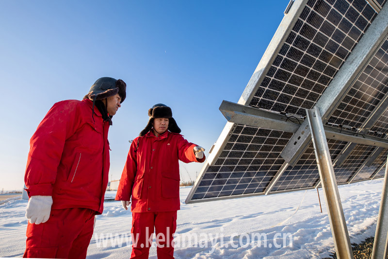 2021年12月29日,吉慶油田作業(yè)區(qū)(吉木薩爾頁巖油項目經理部)五號大平臺微型光伏電站投用,并網發(fā)電,實現綠電采油。 張昀攝