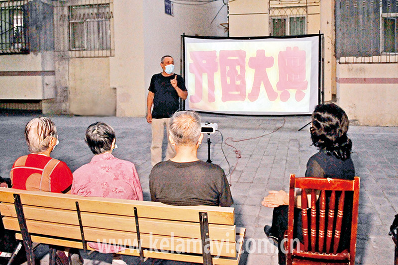 ????“各位鄰居,今天晚上放《開國大典》?!?021年8月22日晚,我市南林社區(qū)棗園居民阿不力米提·阿德瑪洪站在自家樓下,第100次支起支架掛起幕布、架起投影儀……