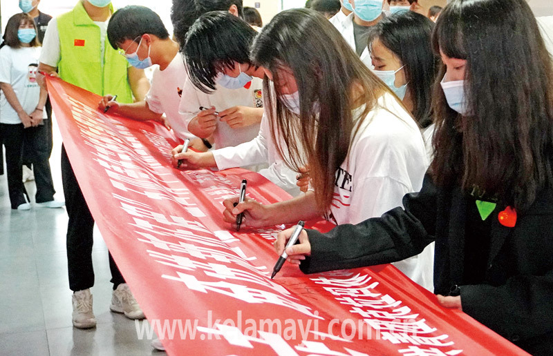 5月4日,在該?!拔逅摹鼻嗄旯?jié)特別主題團(tuán)日活動(dòng)現(xiàn)場(chǎng),團(tuán)員們簽字留念。